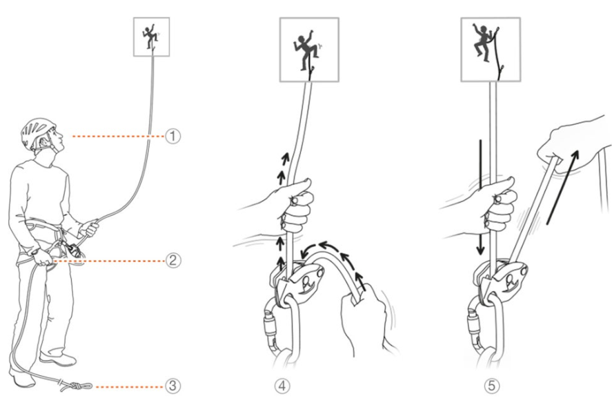 확보기는 와이어 부분을 잠금 카라비너에 걸되, 오돌토돌한 제동 부분이 아래로 향하게 설치합니다. 자일을 확보기에 통과시킬 때는 방향이 매우 중요합니다. 등반자와 연결된 자일(등반줄)이 위쪽으로, 빌레이어가 손으로 잡을 제동줄이 아래쪽으로 향해야 합니다. 이 방향이 반대로 되면 등반자 추락 시 제동이 걸리지 않아 치명적인 사고로 이어집니다. 잠금 카라비너의 스크류를 완전히 잠그고, 스크류가 왼쪽에 위치하도록 조정합니다. 확보기 와이어와 자일이 11자로 나란히 펴져 있는지도 반드시 확인합니다.