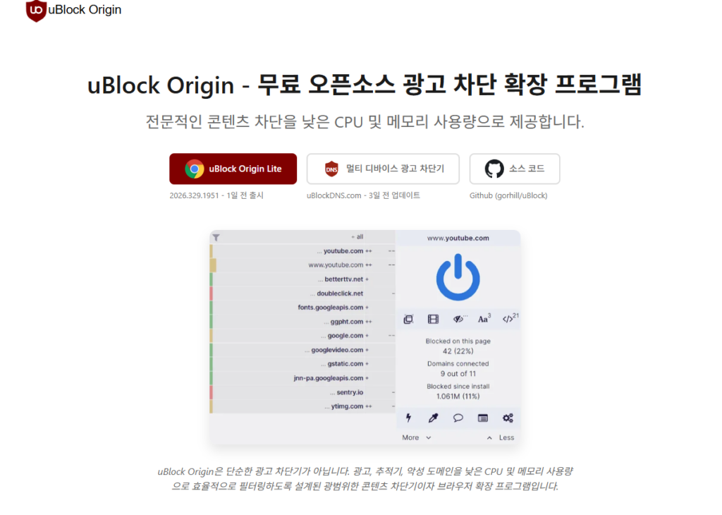 크롬 확장프로그램 중에 제일 먼저 설치하는 거예요. 유튜브 광고, 웹사이트 팝업 광고, 배너 광고를 다 차단해줍니다. 설치하고 나면 인터넷 속도도 빨라지는 느낌이 나요. 광고 로딩 자체가 없어지니까요.