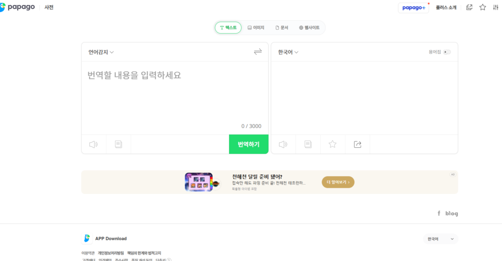 가장 많이 사용하지 싶습니다. 대한민국 1순위 네이버에서 만든 파파고 번역기입니다. 한국에서 가장 많이 쓰이는 번역기 중 하나죠. 제가 느끼기엔 한국어 ↔ 영어 번역에서 가장 자연스러운 결과가 나오는 번역기라고 생각합니다. 이미 대한민국 사람들 대부분 브라우저에 기본은 네이버로 되어있을겁니다. 그래서 번역기 라고 검색을하면 바로 파파고가 먼저 뜨는이유도 한 몫한다고 생각합니다. 많이사용하기에 로우 데이터도 많을 거고 최대한 자연스러운 표현이 잘 만들어지지 않는가 하는 개인적인 읜견입니다.