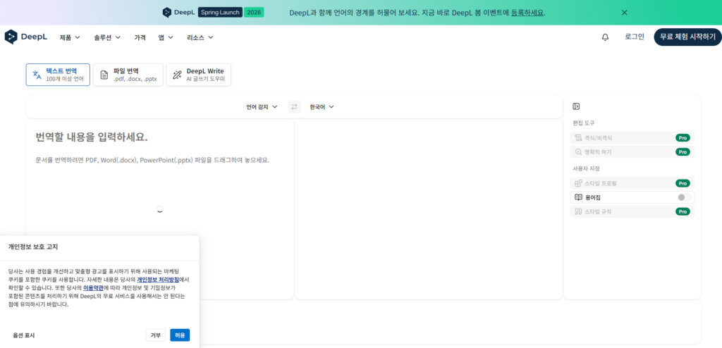 단점아닌 단점이라면.. 지원 언어가 30개 정도로 세 가지 중 가장 적다는 겁니다.. 그리고 무료 버전은 한 번에 번역할 수 있는 텍스트 양에 제한이 있습니다. 파일 번역은 유료 플랜이 필요해요. (맛보기로 시작했다가 지금 유료버전까지 구독해서 팀원들과 공동으로 사용하고 있습니다~!)