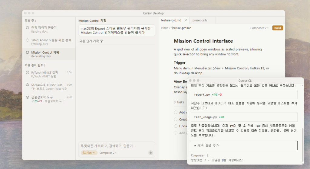 - Composer 기능: 여러 파일을 동시에 수정하게 시킬 수 있음. “이 프로젝트에 다크모드 추가해줘” 한 마디로 파일 10개를 건드림